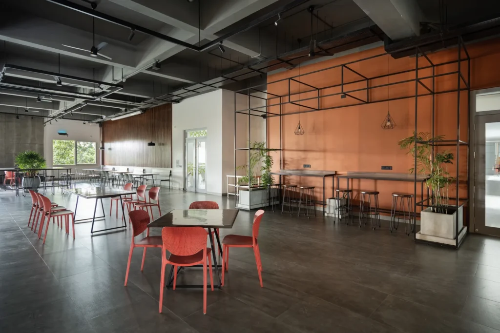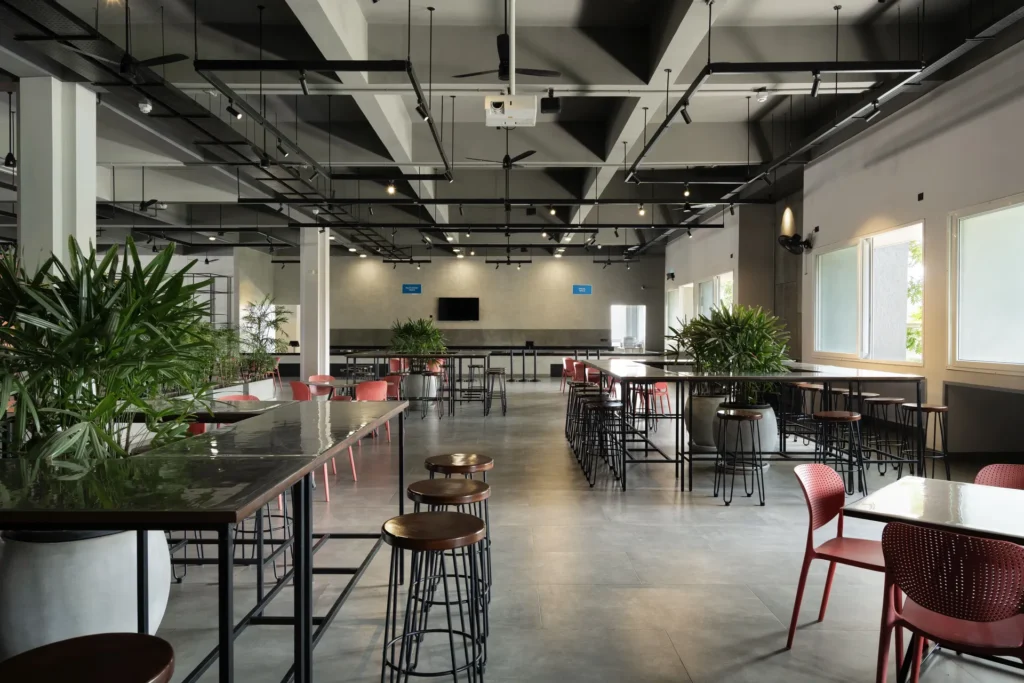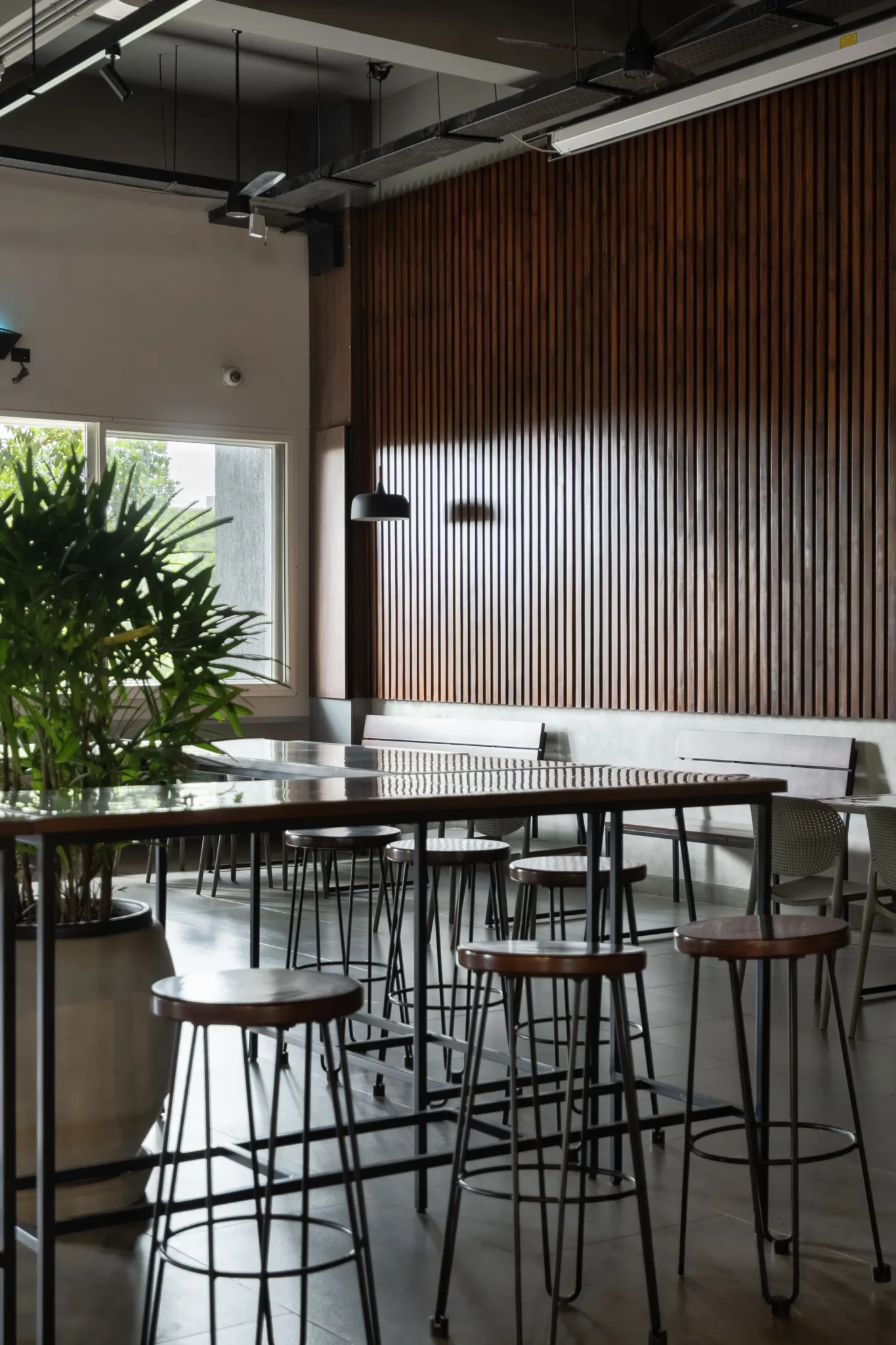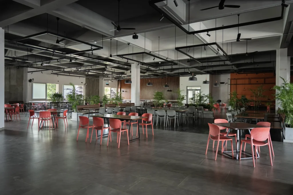 Conversion of old manufacturing space into cafeteria with tropical aesthetics