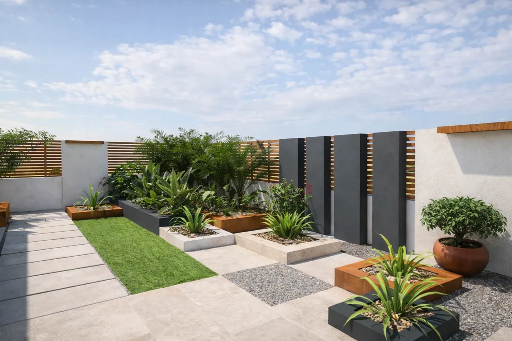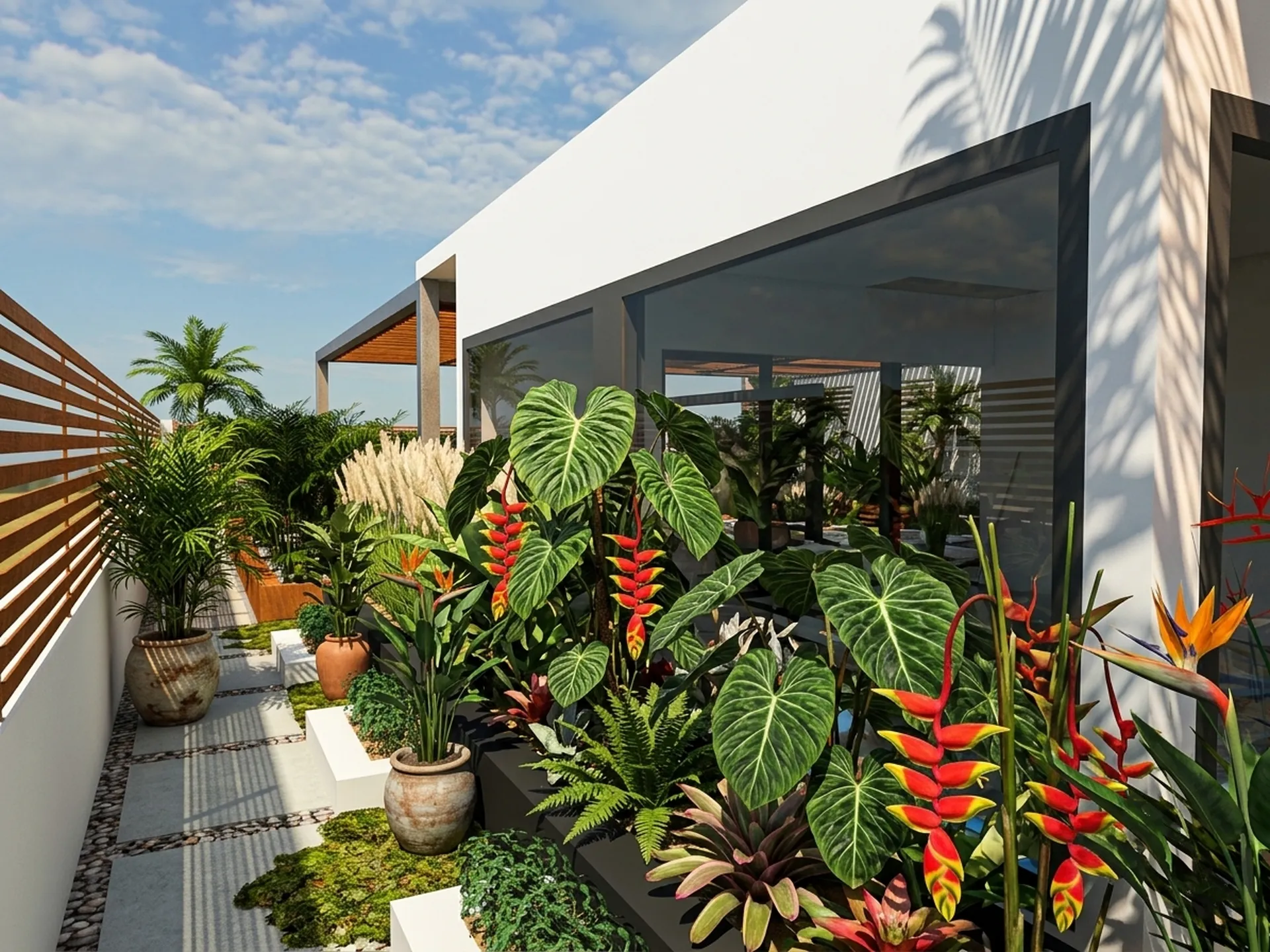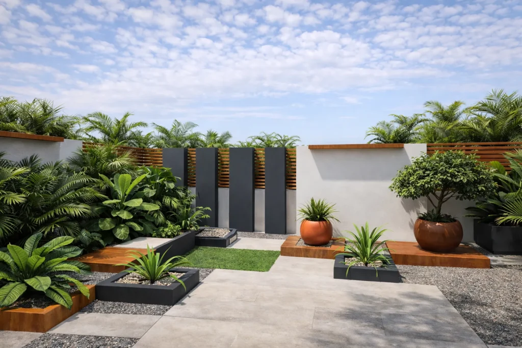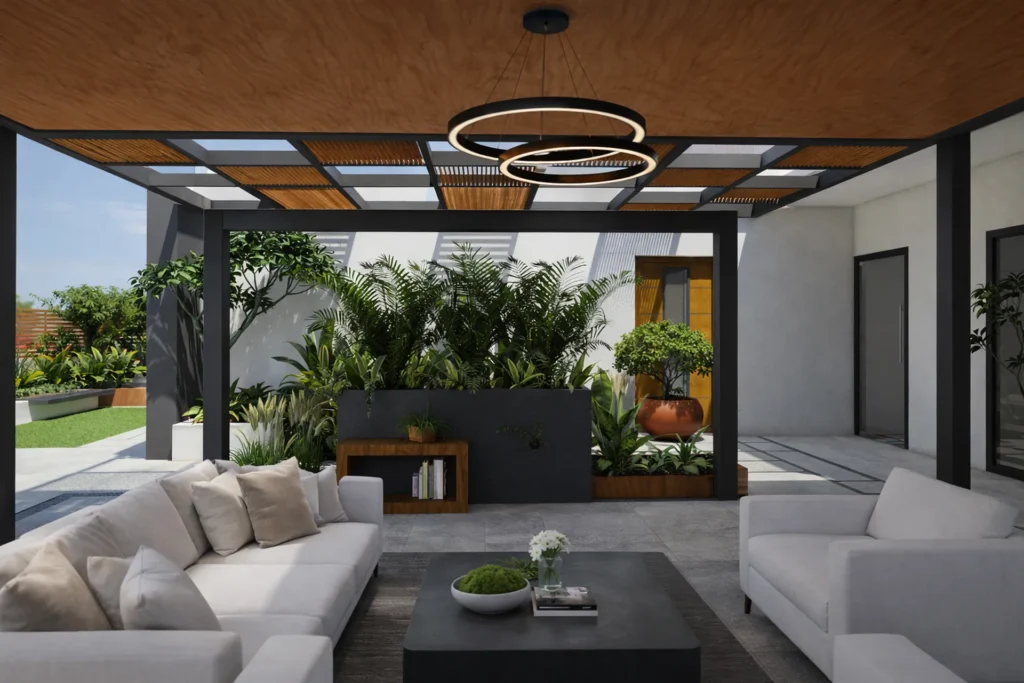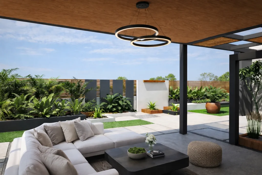Modern workspace blending outdoor collaboration areas with tropical landscaping