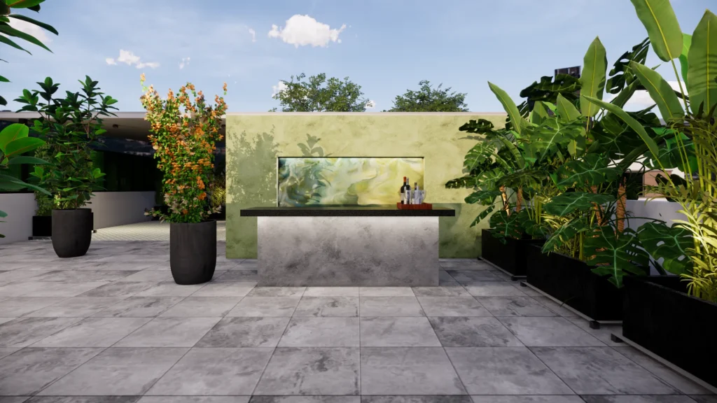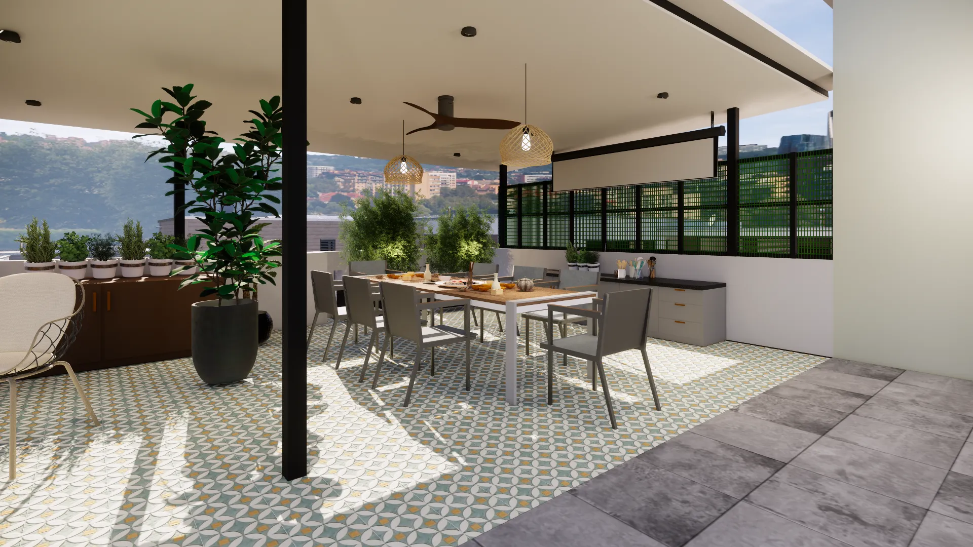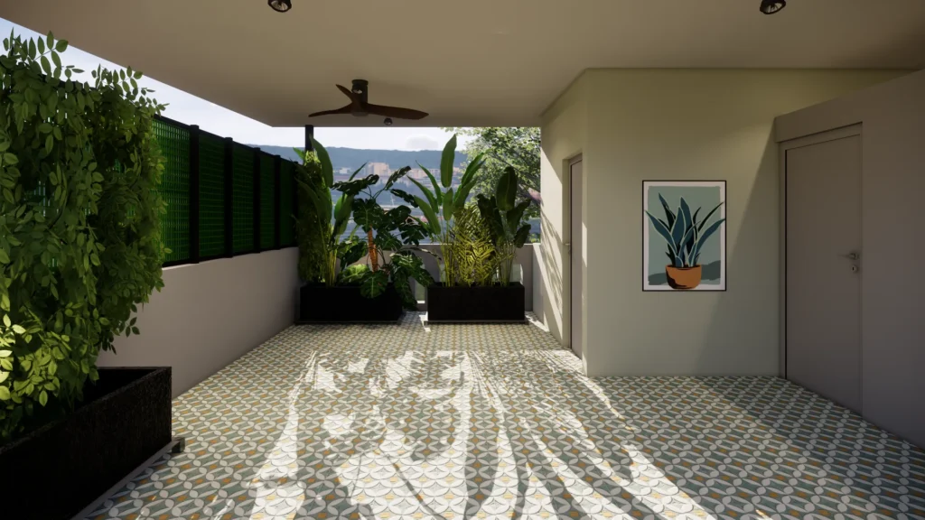 Rooftop oasis offers a peaceful respite from urban life, allowing residents to unwind in a tropical haven.