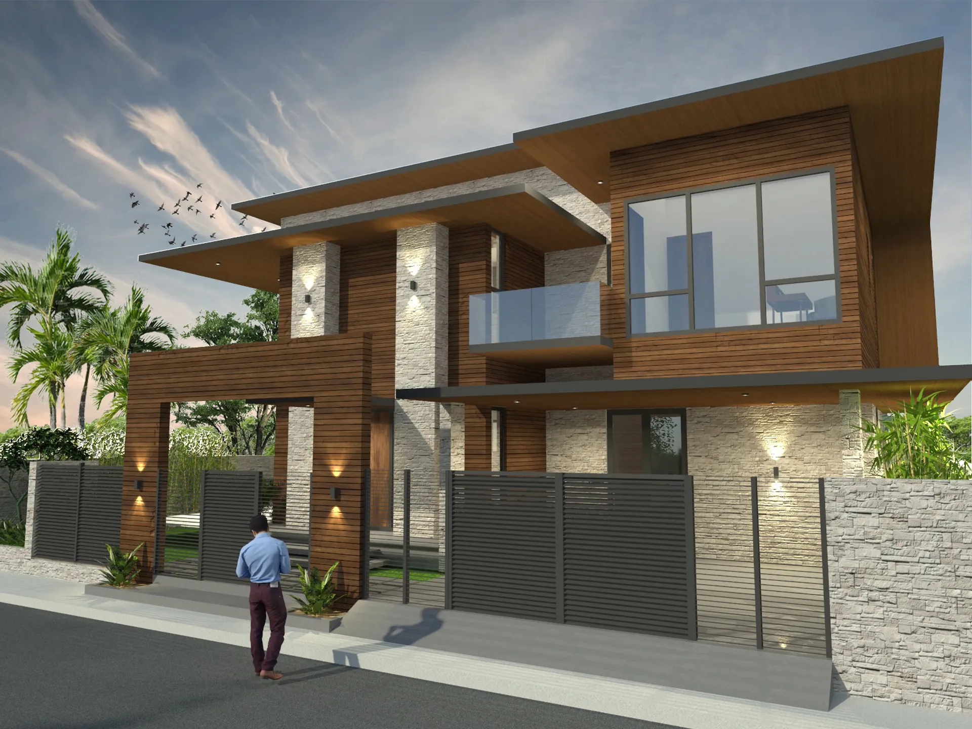A bold composition of timber volumes and stone accents unified under a sweeping roof plane.