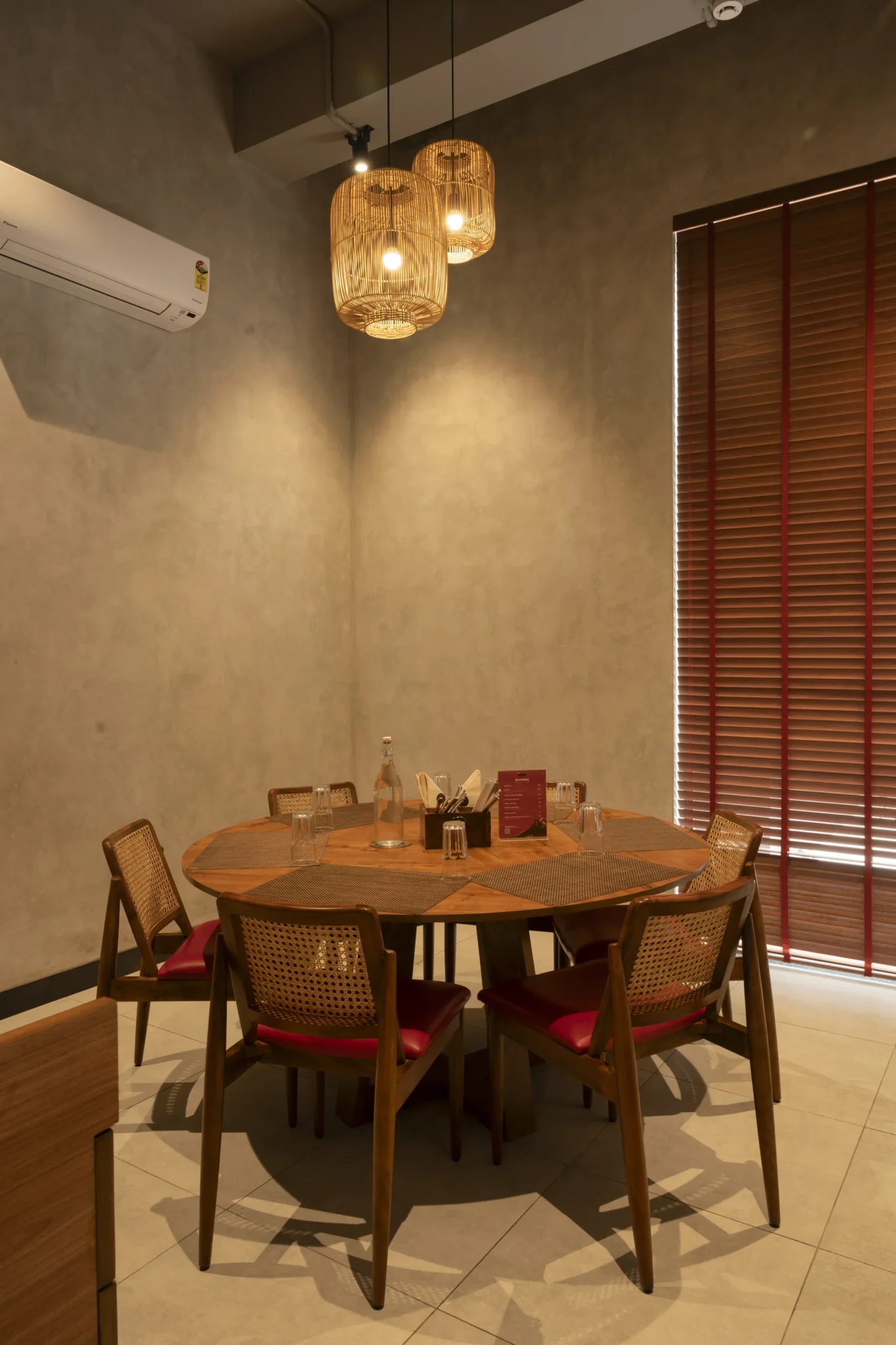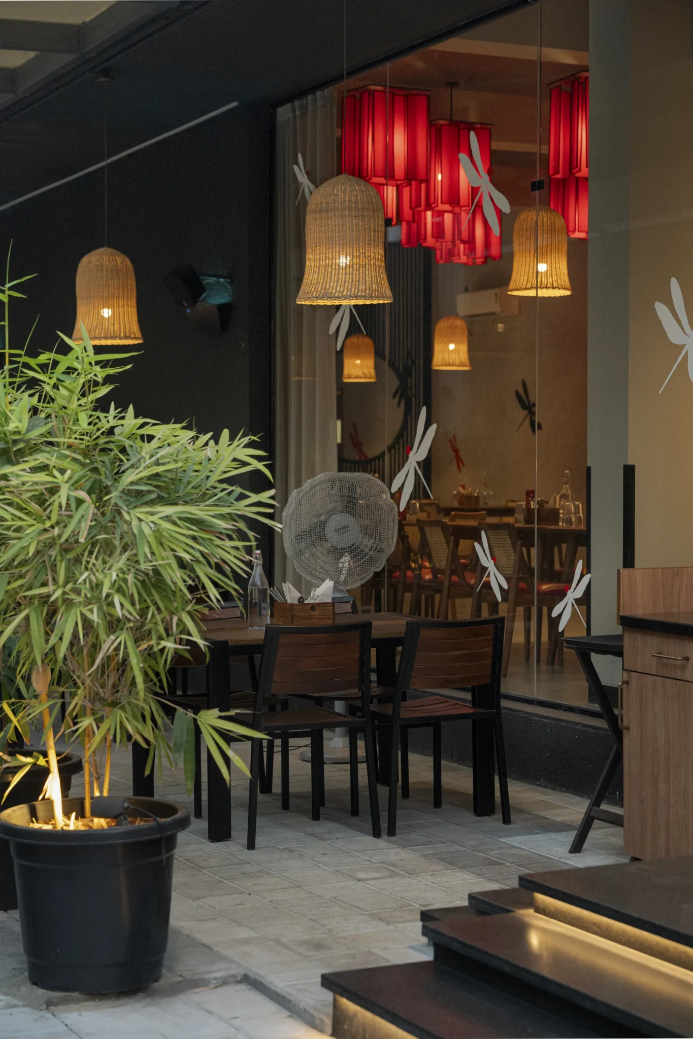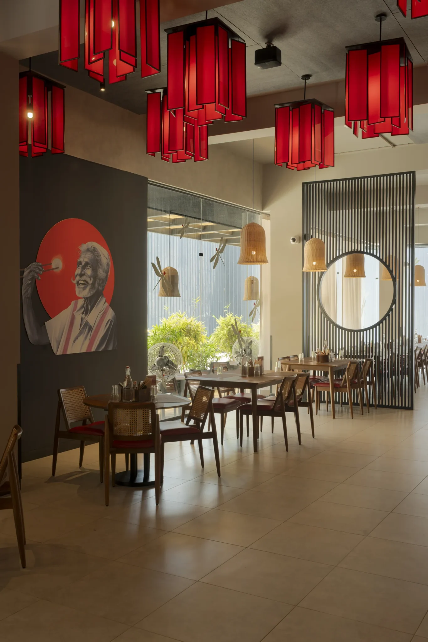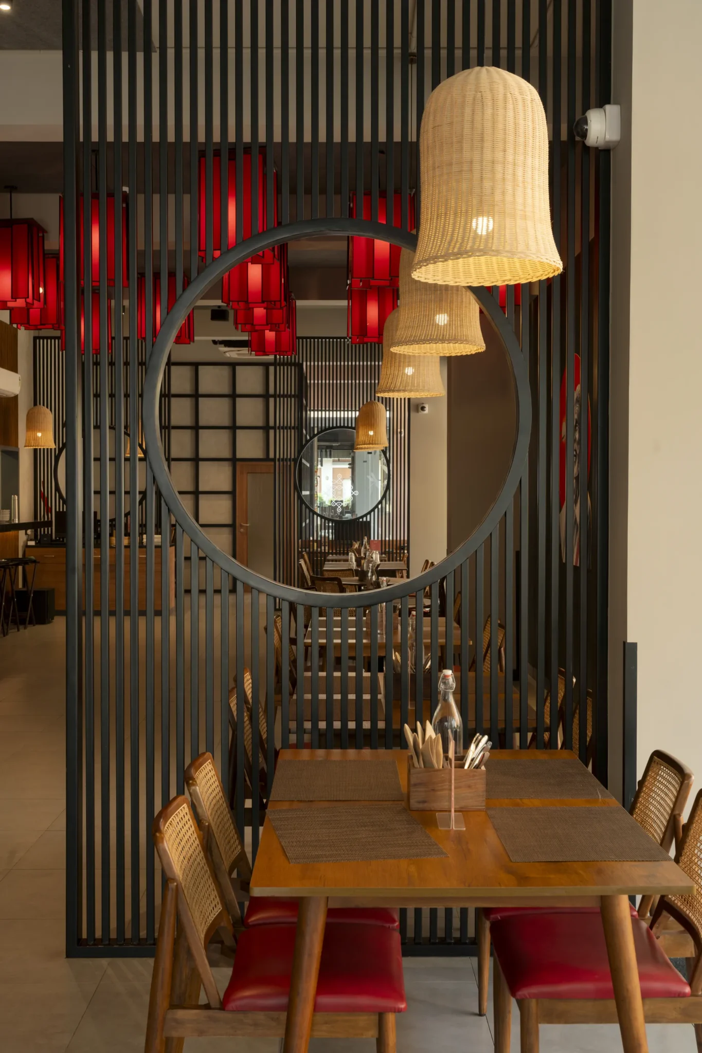 Warm restaurant interior with woven pendants and bold red lantern accents