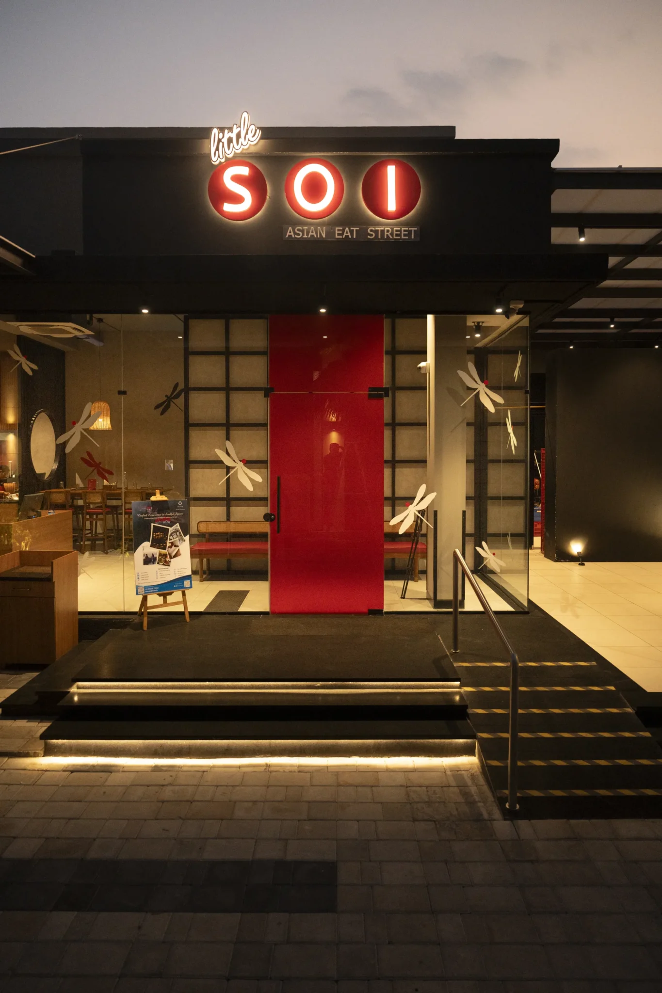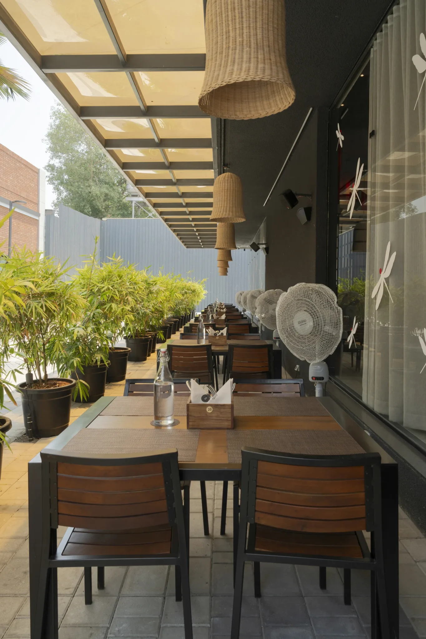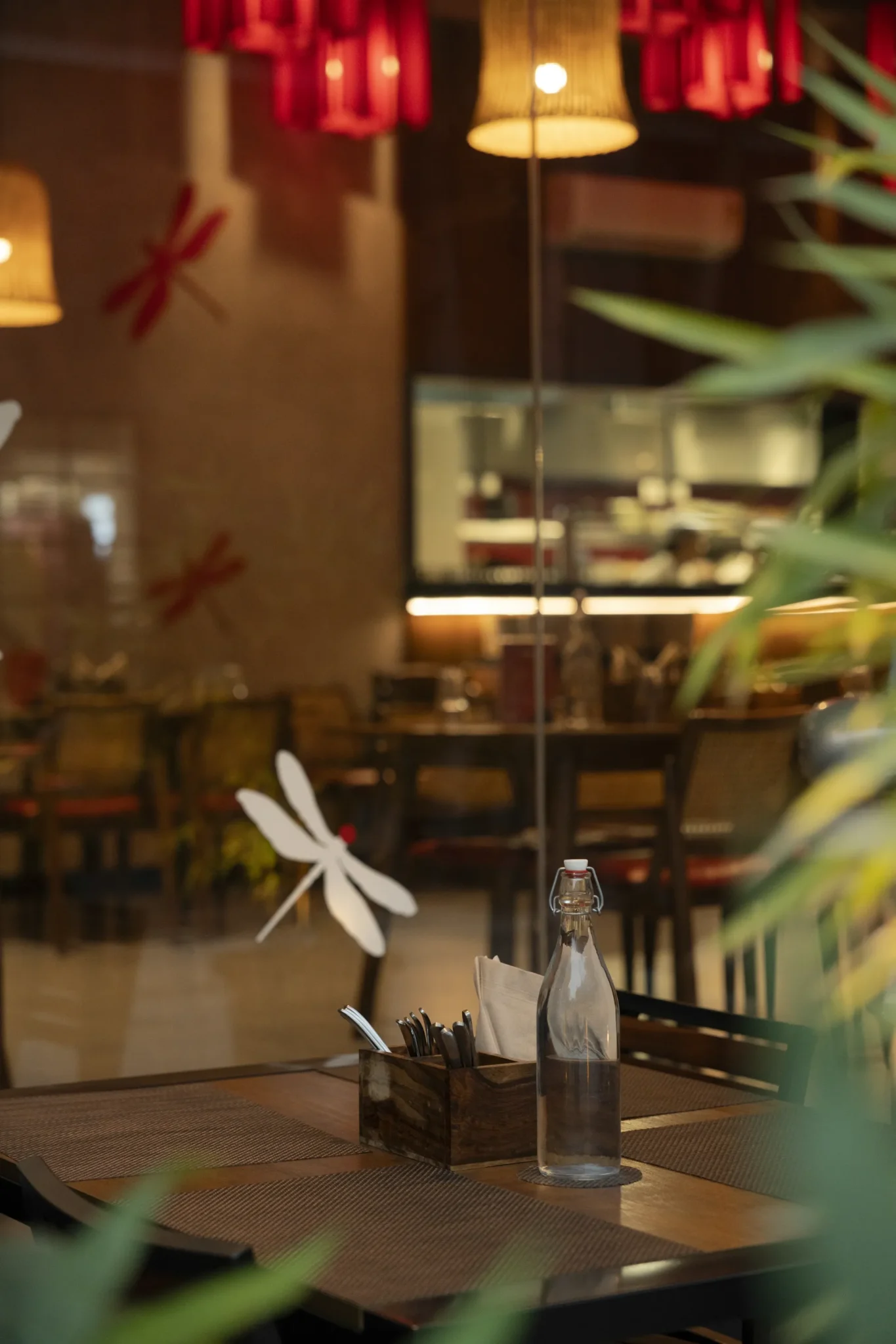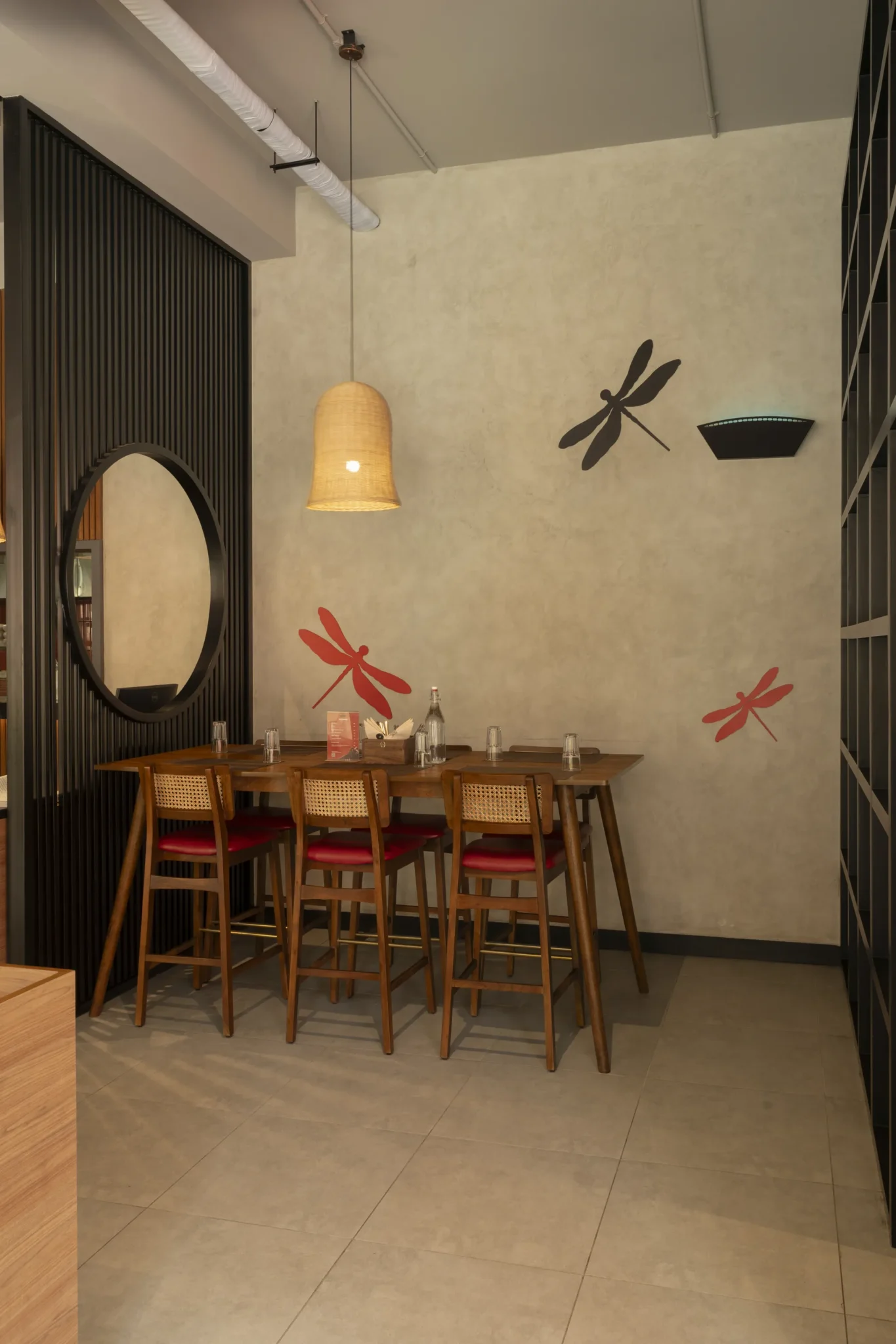 Warm restaurant interior with woven pendants and bold red lantern accents