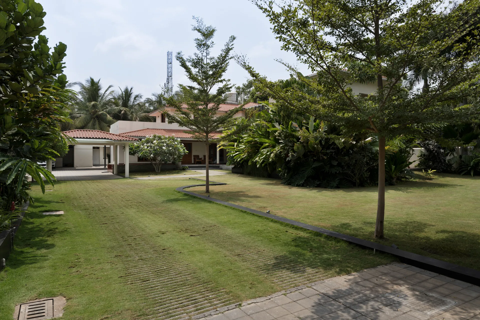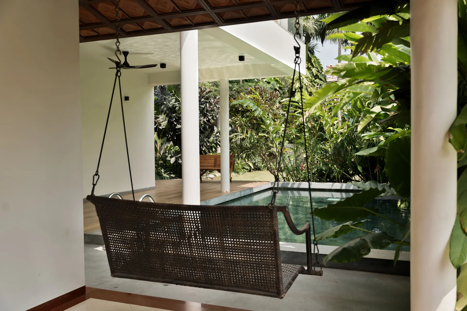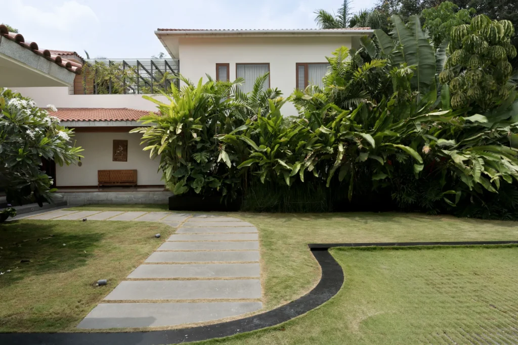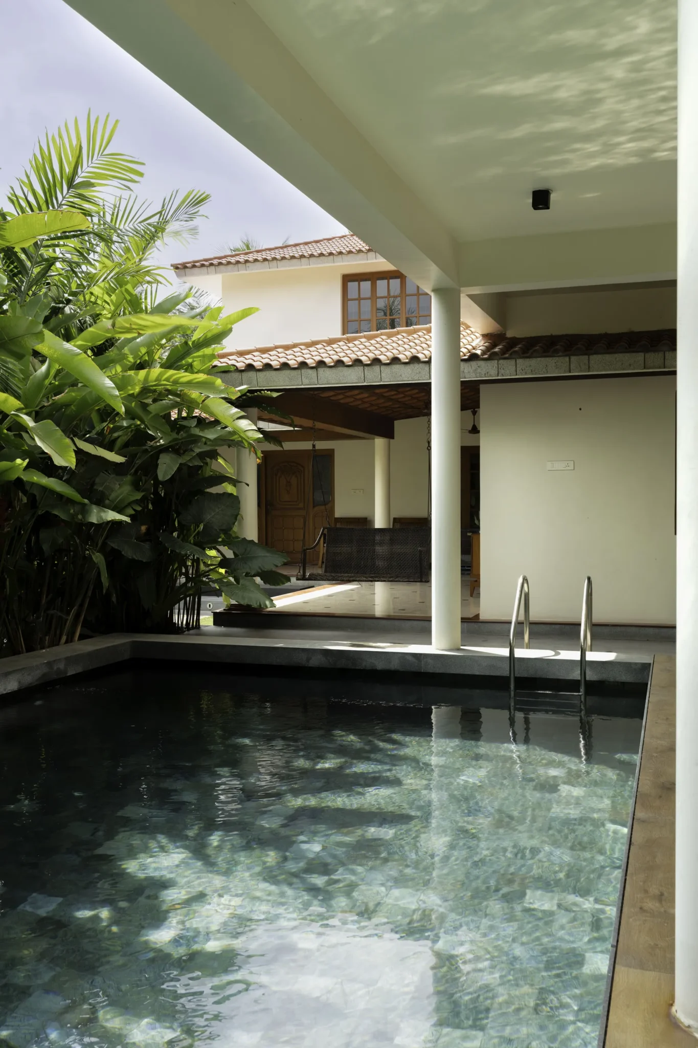 Lush landscape court with an intimate pool as its focal point