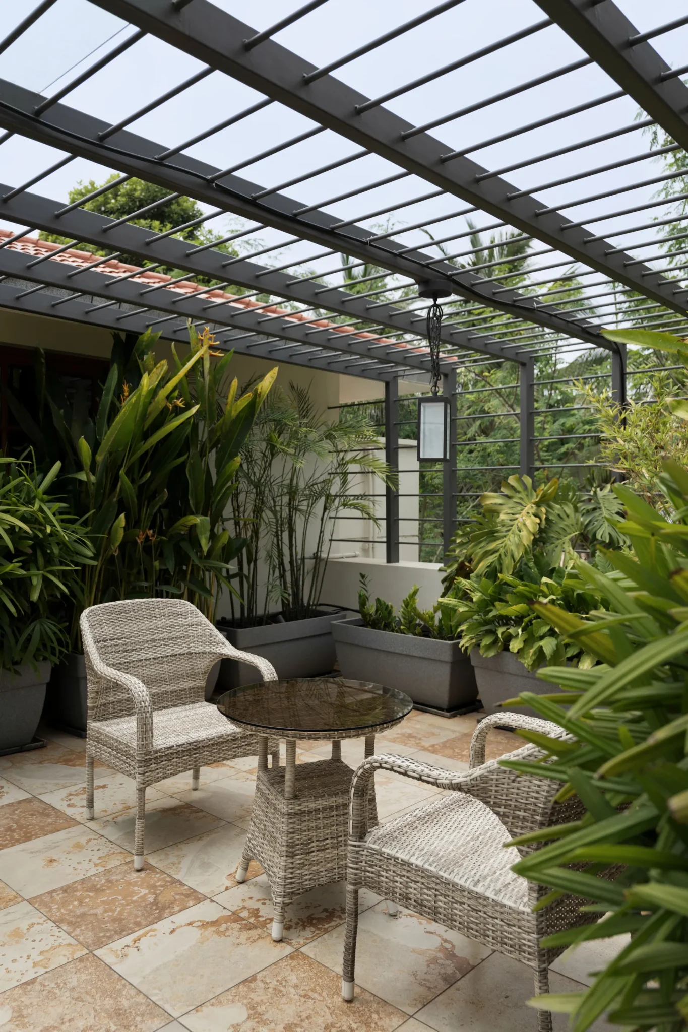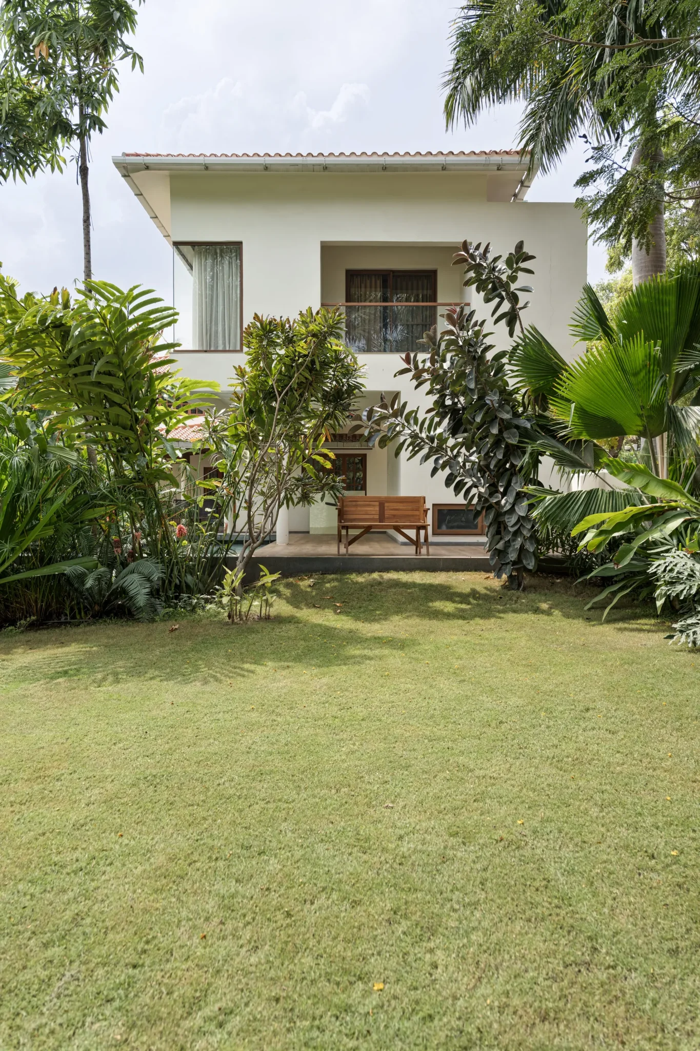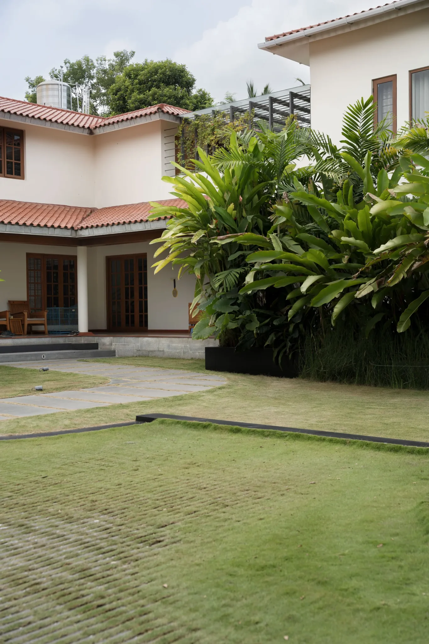 Lush landscape court with an intimate pool as its focal point
